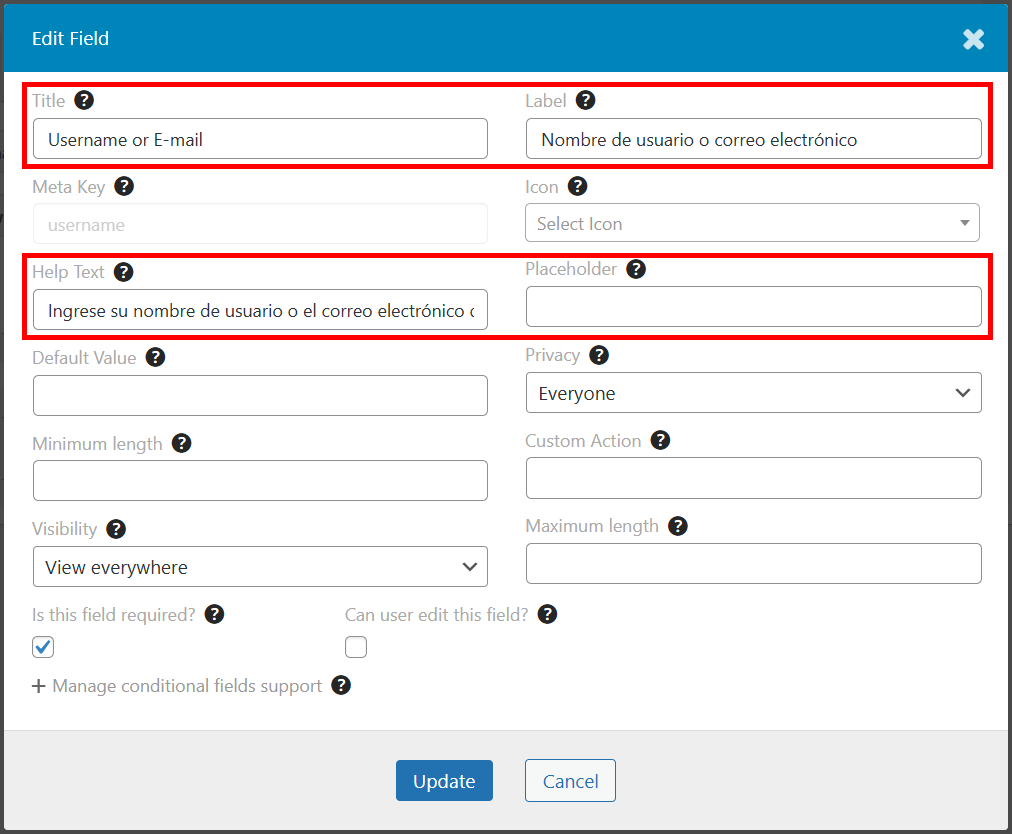 Once forms for languages are created you can open these forms and translate fields. You can translate a Title, Label, Help Text and Placeholder if needed.