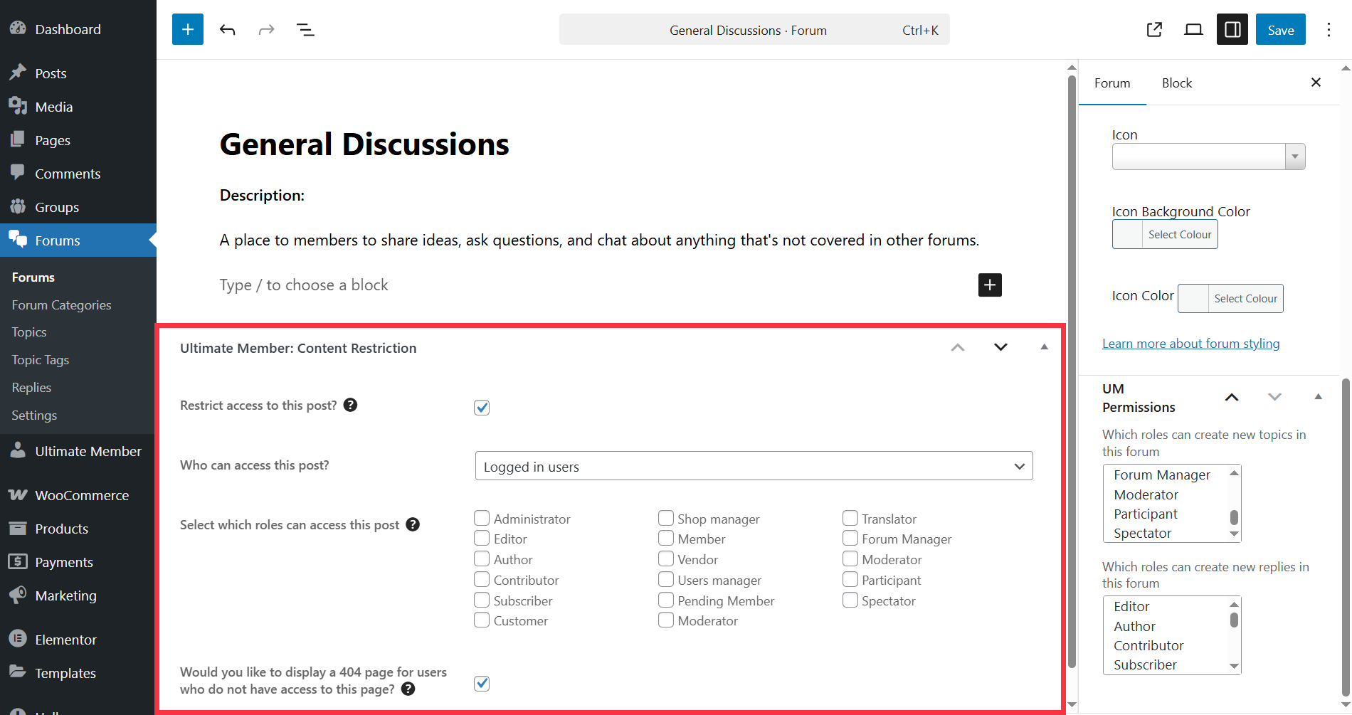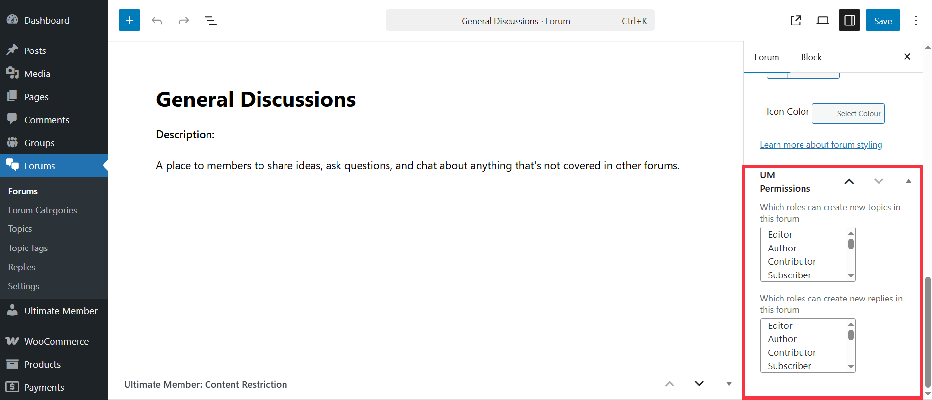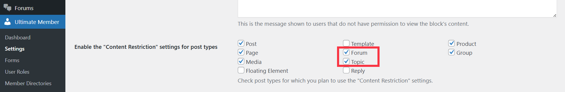 - Activate the "Content Restriction" tool for forums and topics. Go to wp-admin > Ultimate Member > Settings > Access > Content Restriction and enable the "Content Restriction" settings for post types "Forum" and "Topic".
