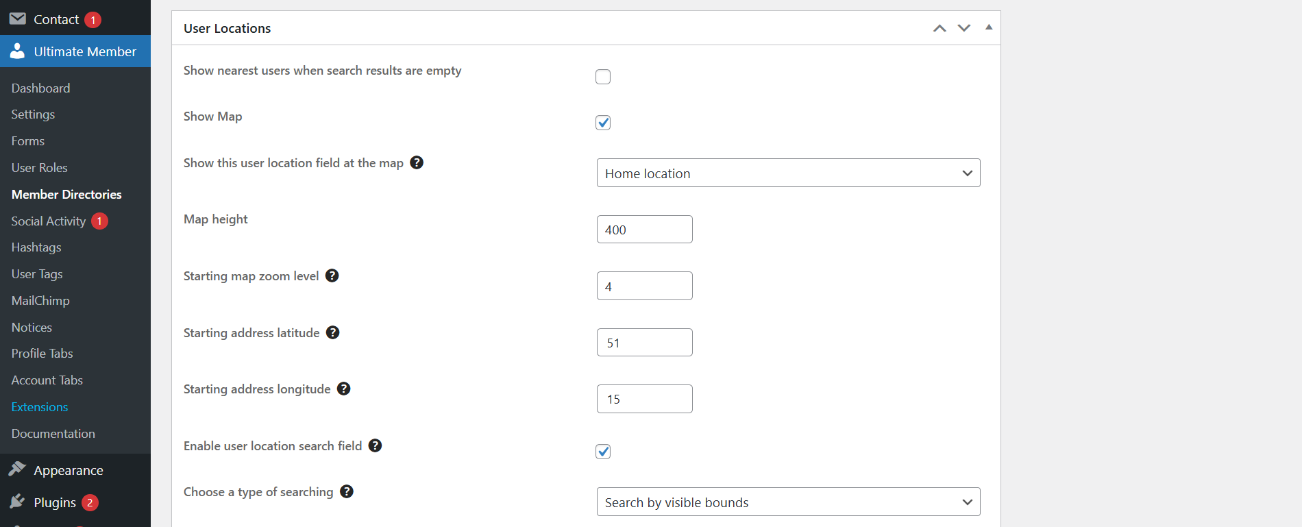 To enable the location searching feature, navigate to wp-admin > Ultimate Member > Member Directory > Edit and scroll down to the User Locations section. Turn on the Show Map setting and choose the User Location field from the drop-down menu in the Show this user location field at the map setting to display a map. Turn on the Enable user location search field setting to enable the location searching.