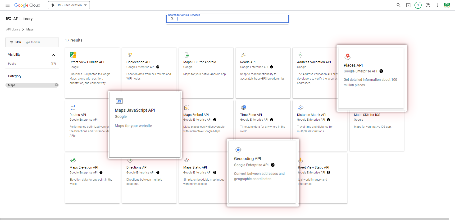 - On the Map section, click on "VIEW ALL" to see all Maps APIs.