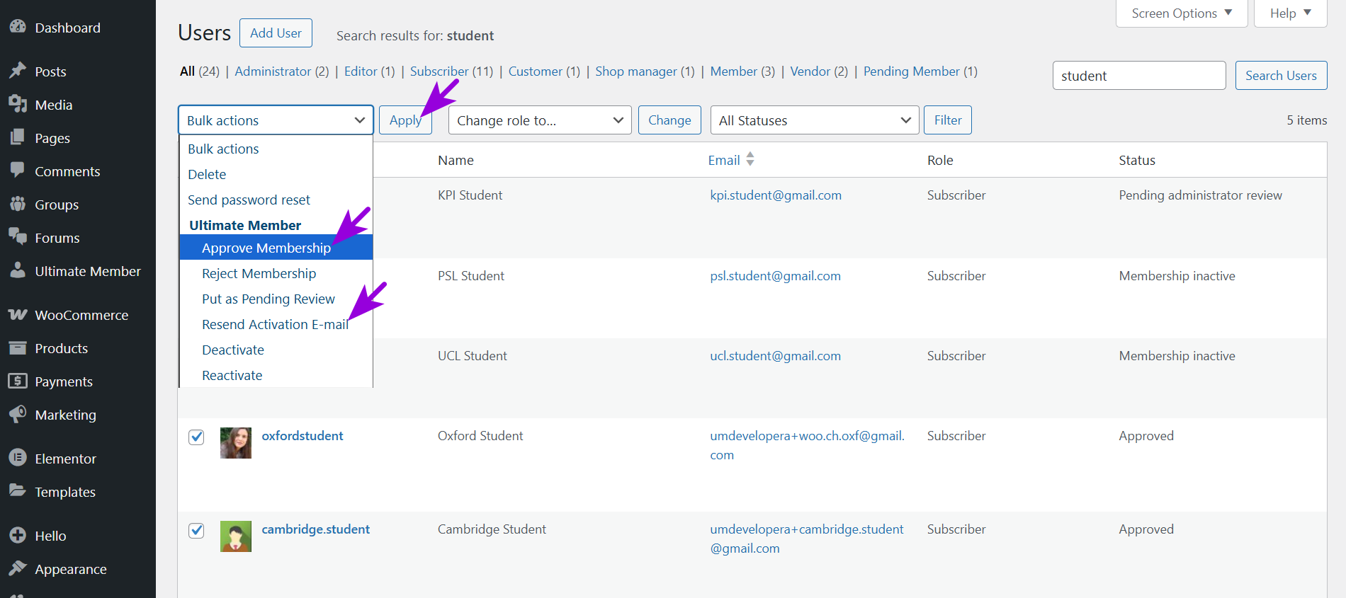 Use bulk action Approve Membership to approve members. The plugin will approve members and send them an email - the Account Approved email for members whose current status is "Pending administrator review" or the Account Welcome email for others.