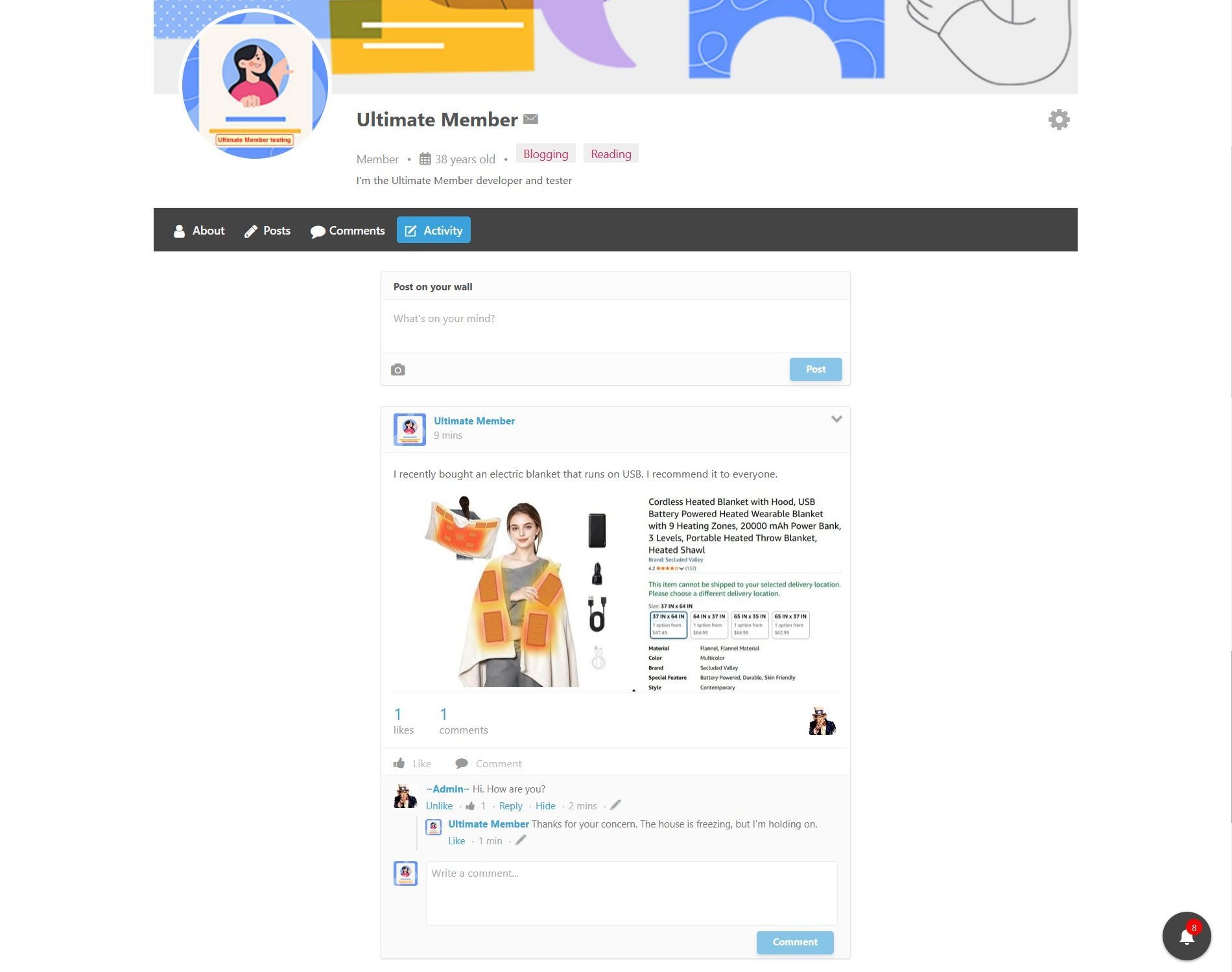 The extension displays posts created by members or addressed them in the Activity profile tab if this tab is enabled, see Profile Menu settings.