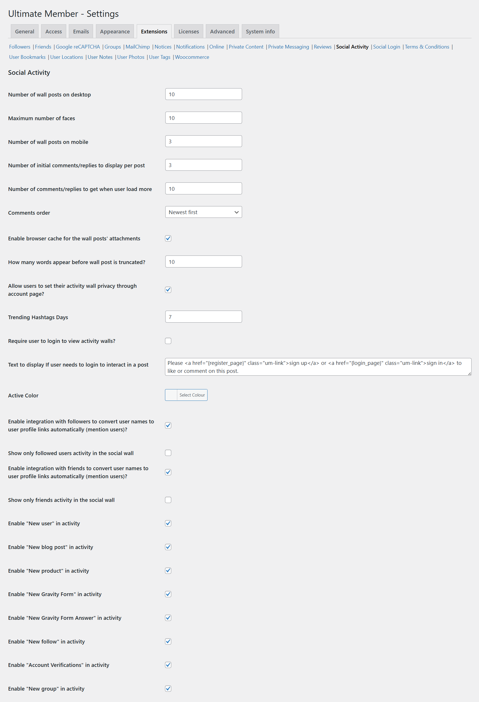 Once the extension is activated, you will see the tab "Social Activity" on wp-admin > Ultimate Member > Settings > Extensions. You can manage extension's settings: