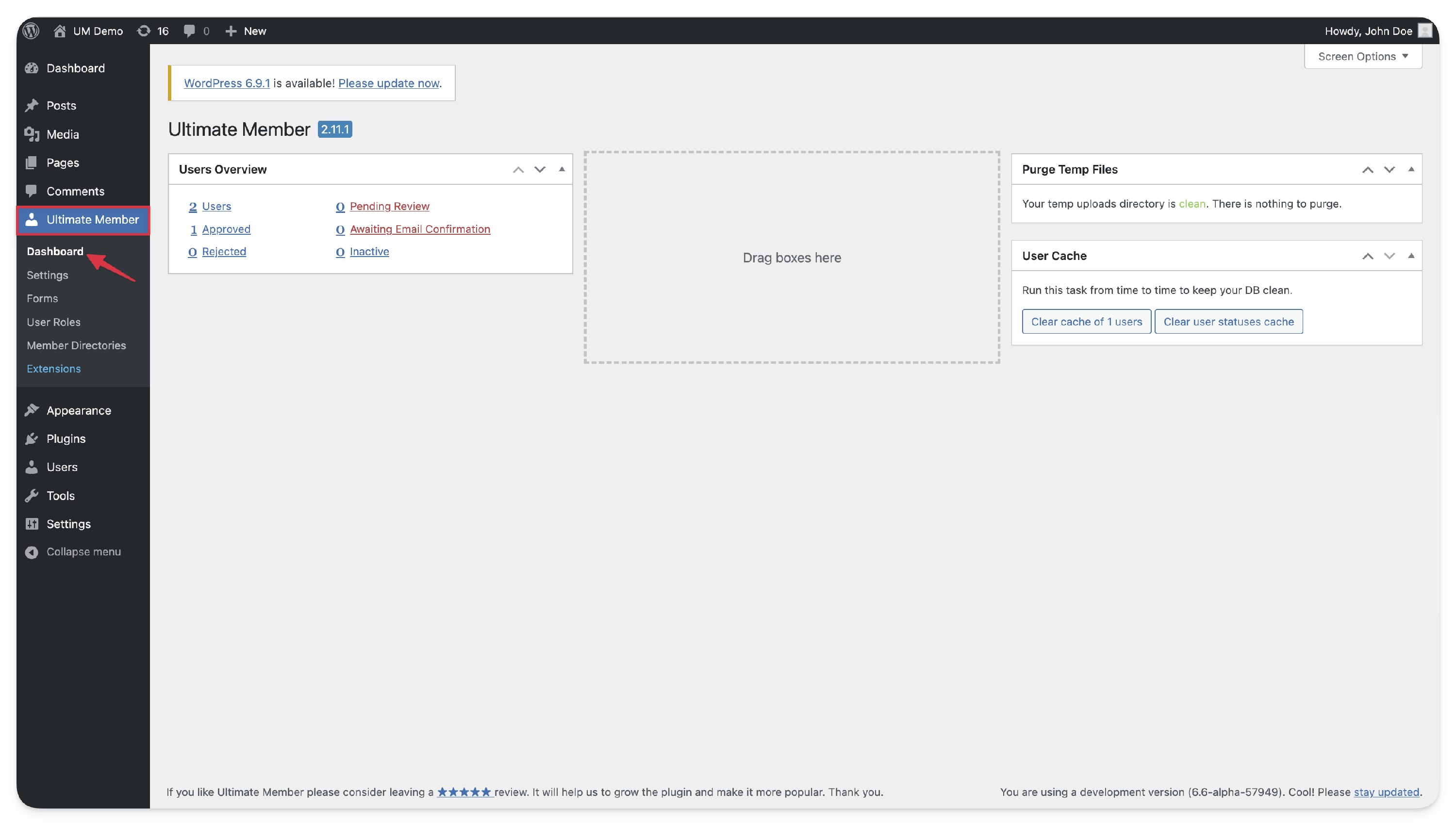 The Dashboard serves as the central hub for the Ultimate Member plugin. It provides a comprehensive overview of user statistics, tools for system maintenance, and extension management.