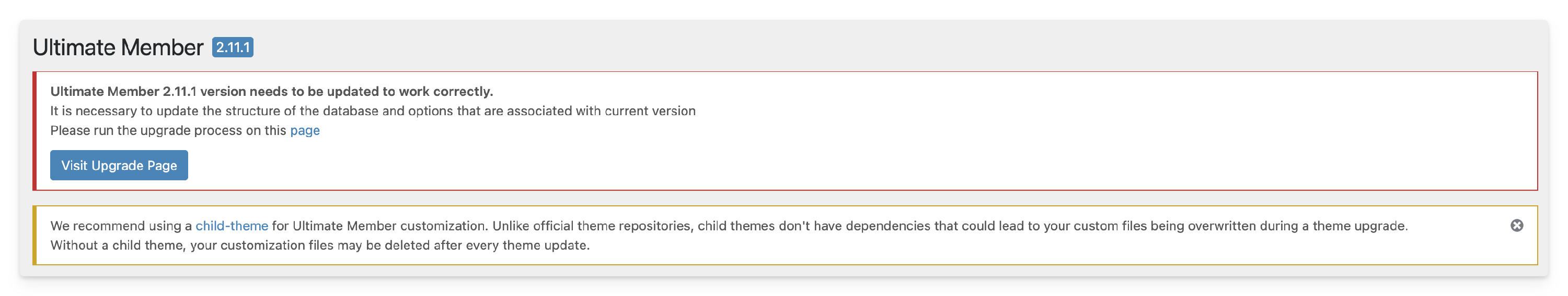 In this section, you can manually check for the latest updates to Ultimate Member extensions. By clicking on the "Visit Upgrade Page" button, the system will query the Ultimate Member servers to ensure your extensions are up-to-date. This feature is useful if you need to quickly verify you're running the latest versions or if automated updates are not functioning as expected.