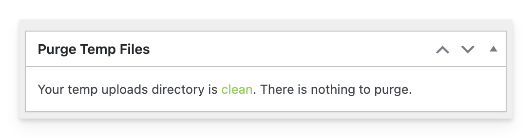The " Purge Temp Files" button allows you to clean up these abandoned temporary files. This is important for maintaining server storage efficiency and ensuring your system isn't bogged down by unnecessary data. If the temp uploads directory is already clean, the "Purge Temp Files" button will not be displayed. Instead, you will see a message stating: "Your temp uploads directory is clean. There is nothing to purge."