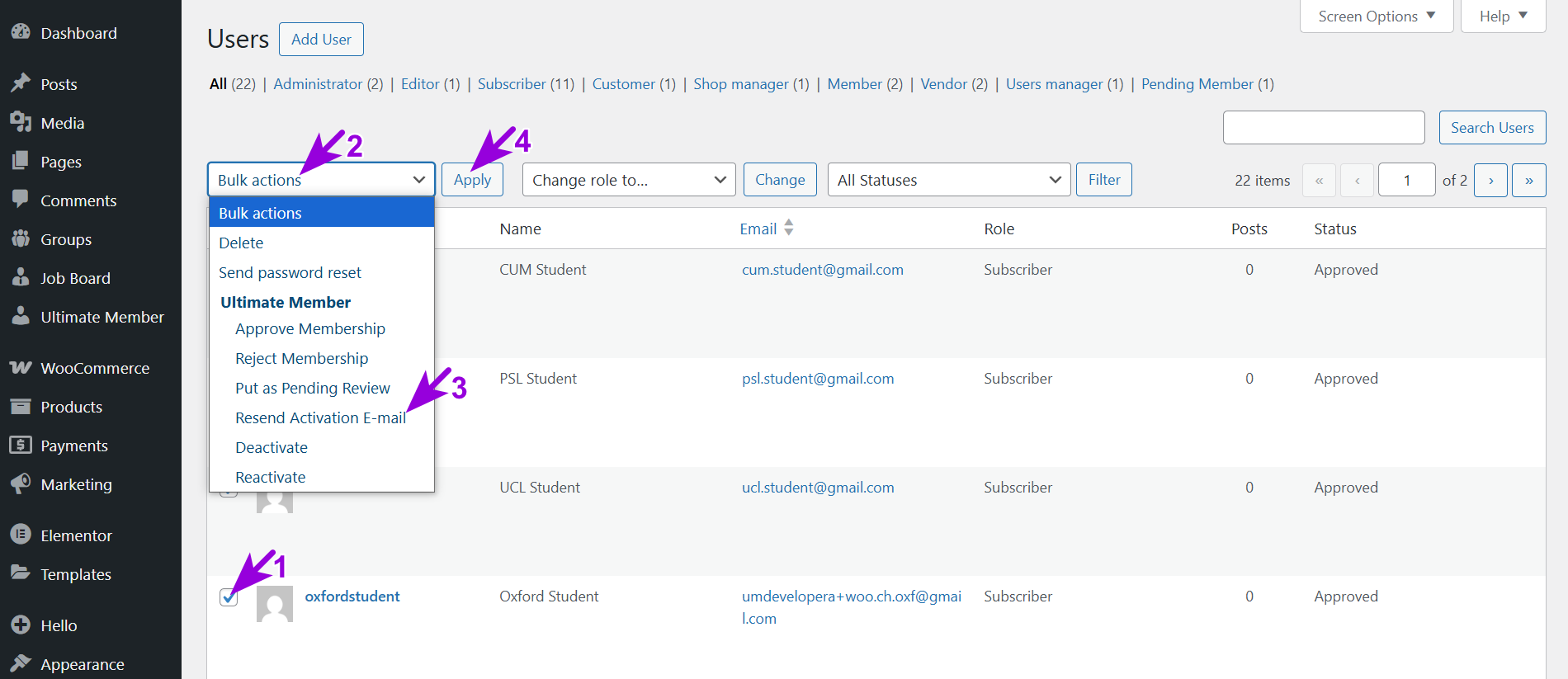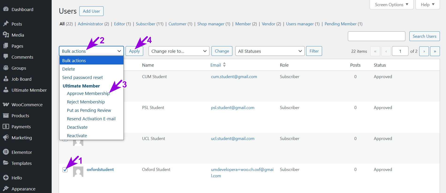 Select imported users on the first page, choose the Approve Membership in the UM Action dropdown and click the Apply button. Do the same on the second page and next pages.