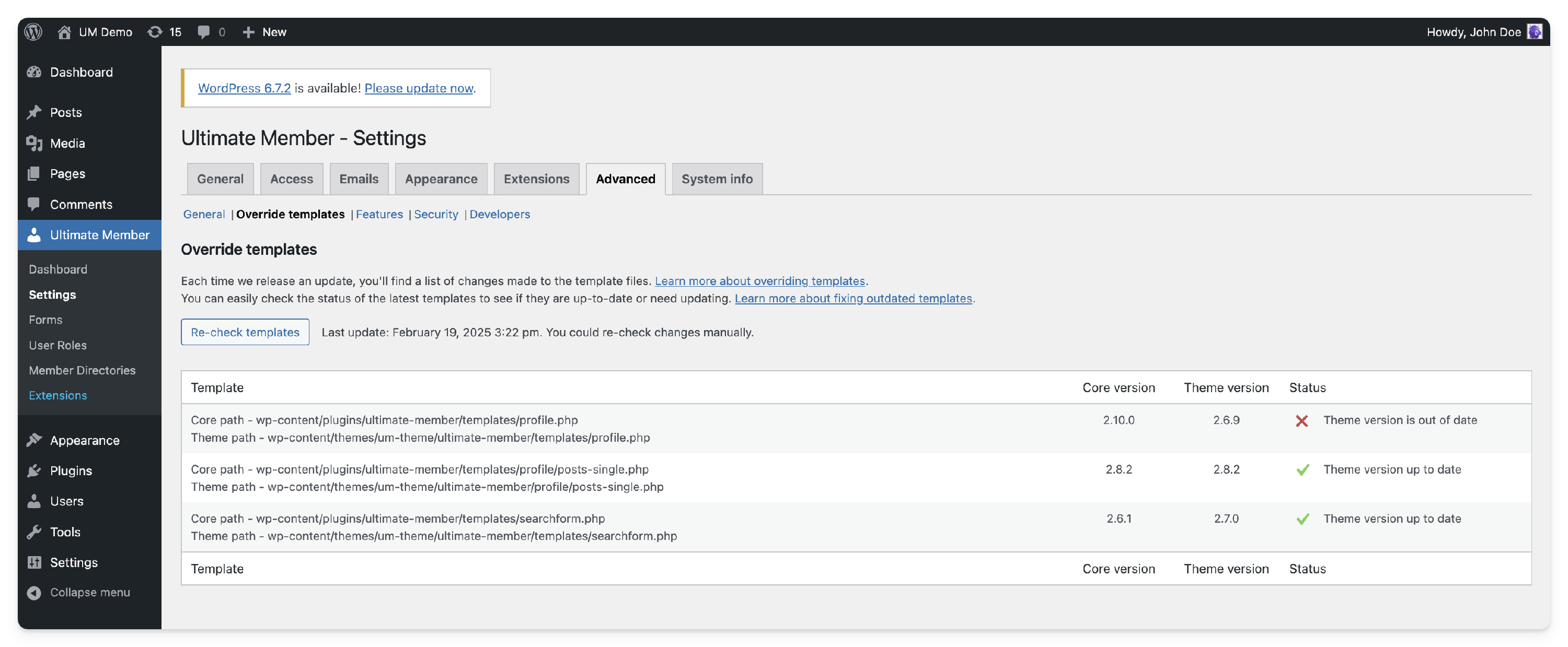 - Navigate to wp-admin > Ultimate Member > Settings > Advanced > Override templates. Here you can find a list of templates that have been overridden by your theme or child theme, as well as a warning notice that they need to be changed.