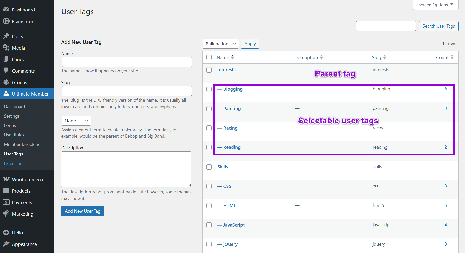 The extension adds the User Tags link to the Ultimate Member submenu. This link navigates to the User Tags screen where you can create and manage user tags.