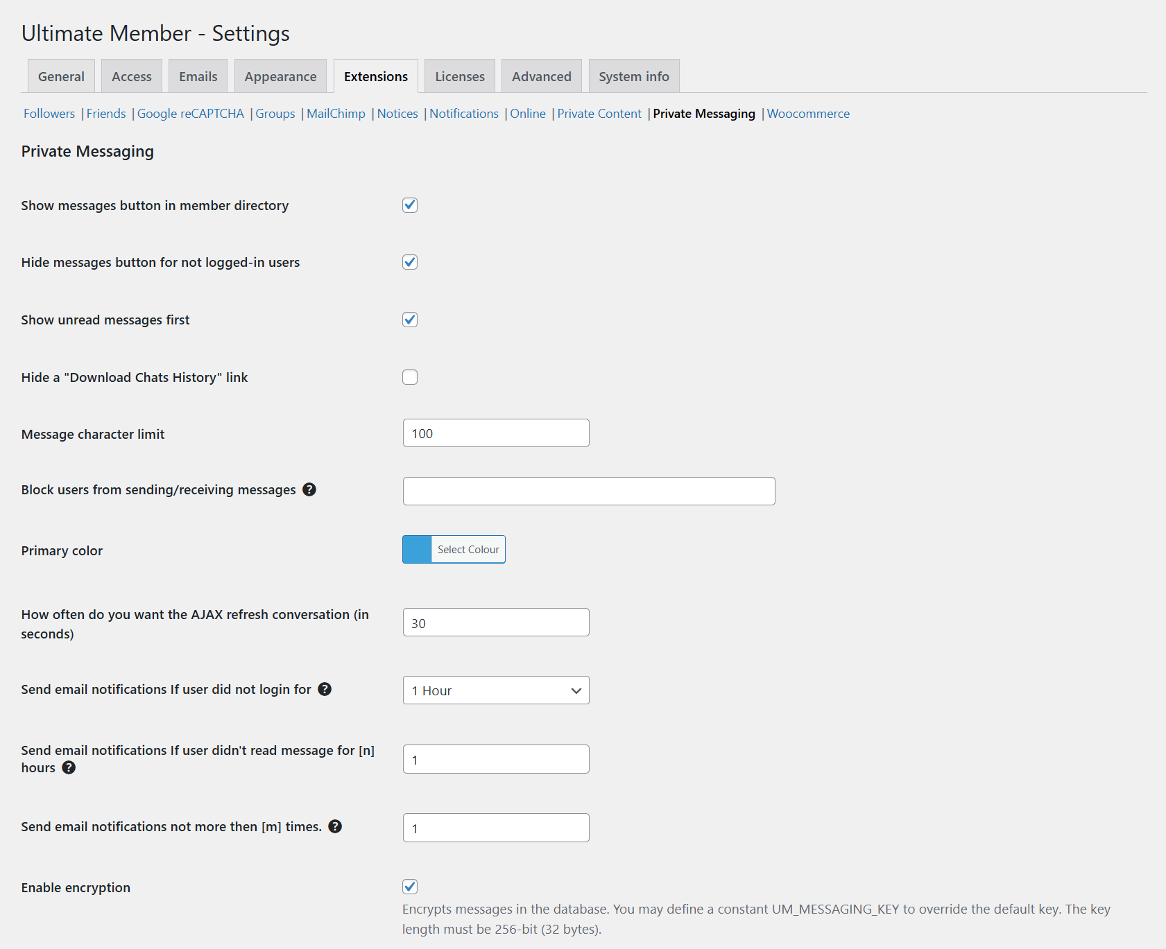 - Enable encryption - Encrypts messages in the database. This feature requires the Sodium PHP extension to be installed. The default key is a hash from the NONCE_KEY constant. Use the UM_MESSAGING_KEY constant to define a custom 256-bit key.