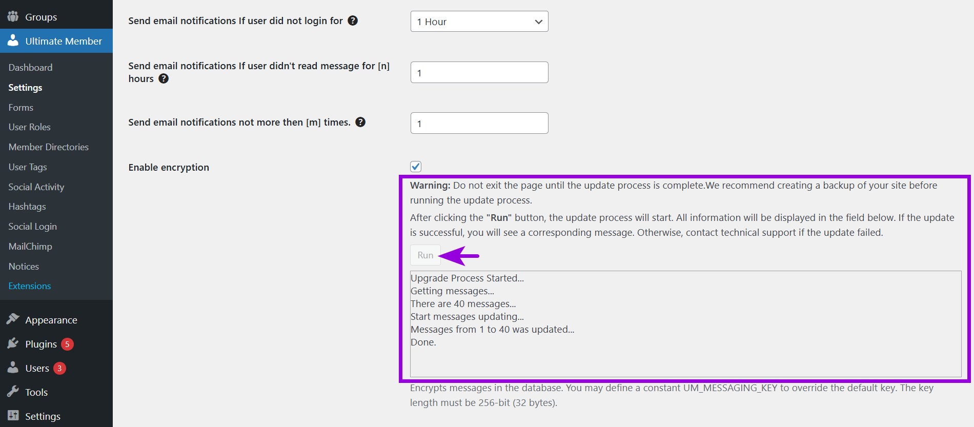 After turning on the Enable encryption setting you'll see a tool to update messages in the database. Click the Run button to start the update process. Do not exit the page until the update process is complete. We recommend creating a backup of the wp_um_message database table before running the update process.