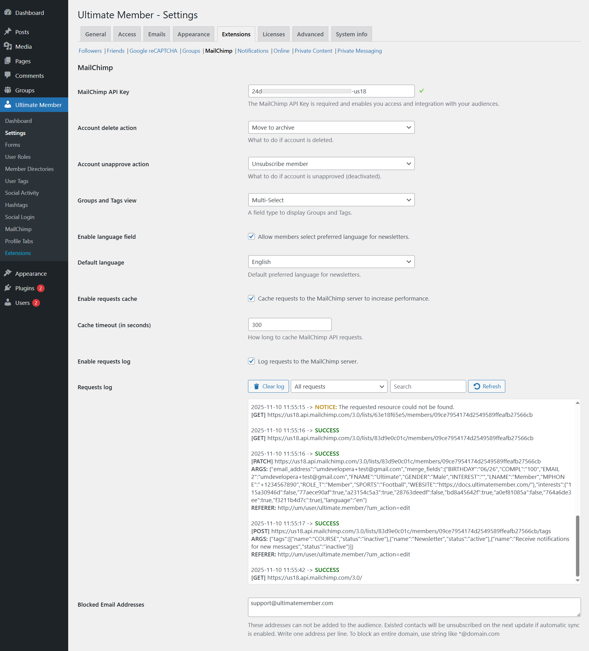 Once you activate the extension, you will see the MailChimp tab on the page wp-admin > Ultimate Member > Settings > Extensions. On this tab, you can find these settings: